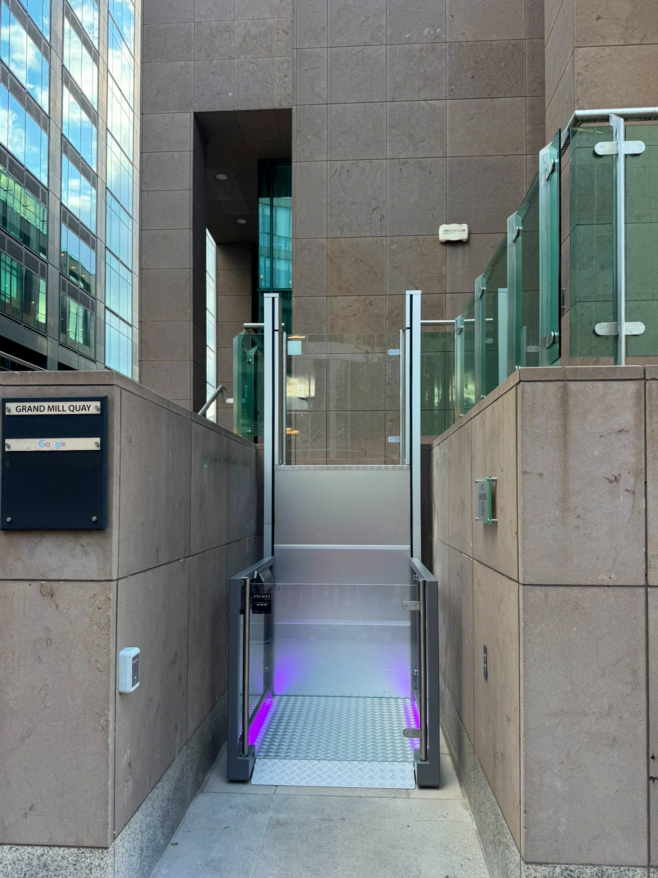 Located at the heart of Dublin’s tech quarter, this sleek open-style vertical platform lift was installed at Google’s Grand Mill Quay campus. Commissioned to enhance accessibility between street and terrace level, Premier were brought on board to deliver a fully compliant, user-friendly solution within a striking modern environment.